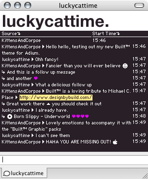 DescriptionBuilt™ is a tribute to the work of Michael C. Place, http://www.designbybuild.com.Contains So thanks goes to Build of course for being the inspiration, the Adium team for this wonderful piece of software and Zaudragon on the Adium forum for the help with the scroll bar problem. Images![]() ![]() ![]() CommentsYou can reply to individual comments by clicking the "Reply" link next to each. # by sleepwalkers on 06/29/06 at 16:16:14Would it be possible to make a version where the header stays at the top of the IM window, as opposed to moving up out of view?