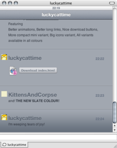 Could you make it possible to turn off the message fade in and smooth scrolling? Watching every message I type fade in is really annoying in quick succession. It was a nice touch at first, but got aggravating quickly. Also, you make it so that messages with the same time stamp are grouped? It's also annoying seeing a rule line dividing messages sent in quick succession; I wish they would be grouped like in the default Stockholm style. Other than those things, I think this style rocks. # by ekologik on 02/13/09 at 06:14:09the slate in this makes for an excellent theme. just one thing that kinda bugs me is when one user types more than one line (before the other responds) there's no icon beside any lines after the first, which makes for a large empty space... doesn't look as nice. any way to fix this or at least make in an optional variant?